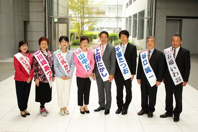 【写真左から】山口みちこ予定候補(古河市区=定数3)、川崎あつ子予定候補(東海村区=定数1)、江尻かな予定候補(水戸市・城里町区=定数6)、山中たい子予定候補(つくば市区=定数5)、上野たかし予定候補(取手市区=定数2)、千葉たつお予定候補(日立市区=定数4)、谷口誠一予定候補(牛久市区=定数2)、石嶋いわお予定候補(筑西市区=定数2)