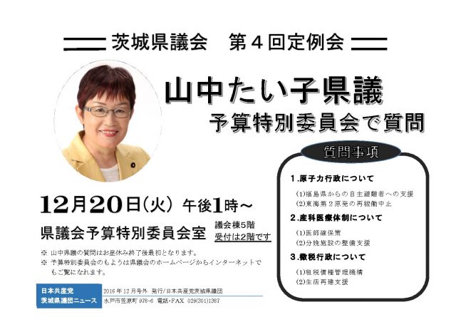 茨城県議会 12月20日の予算特別委員会で山中たい子議員が質疑 2016年12月16日 第4回定例会開会中の茨城県議会は12月14日、本会議を開き、予算関係議案を予算特別委員会に再付託しました。 予算特別委員会は20日に開かれる予定。 日本共産党の山中たい子議員は午後1時から40分間、原子力行政や産科医療体制、徴税行政などをめぐる問題を取り上げ、橋本昌知事の姿勢をただすことにしています。 (「しんぶん赤旗」 首都圏版 2016年12月16日付より転載)