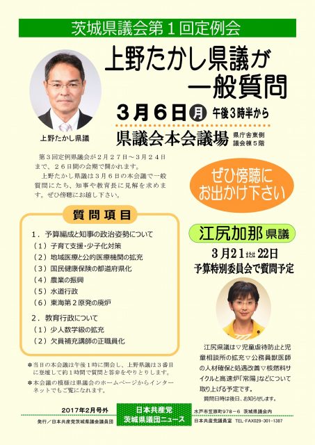 2017年度当初予算案、条例案などを審議する茨城県議会第1回定例会が2月27日から始まりました。