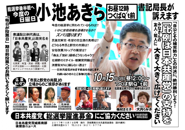 10・15小池晃書記局長来る!お誘い合わせてお越しください! 2017年10月13日 とき 10月15日(日)午後12時~ ところ つくば駅Q’t前 弁士 衆院茨城3区・林みやこ、同6区・古沢よしゆき両候補、梅村さえこ・大内くみ子両北関東比例候補も訴えます