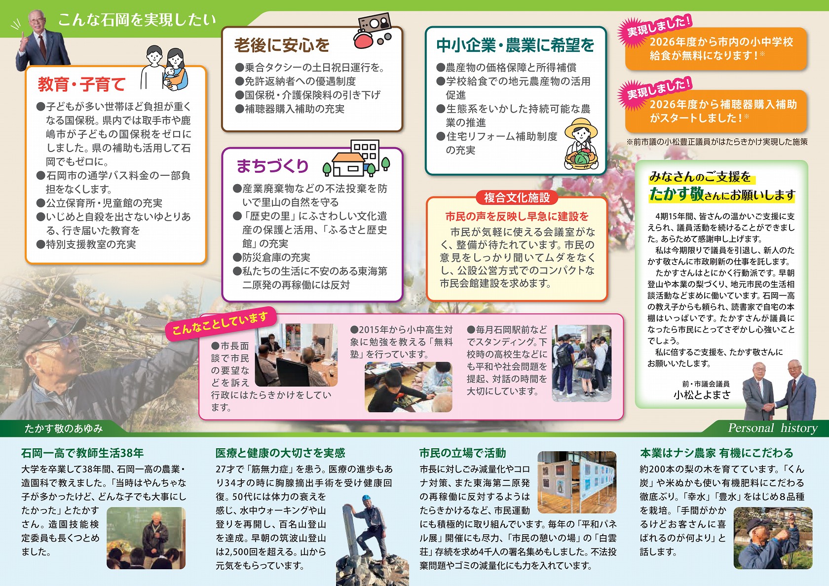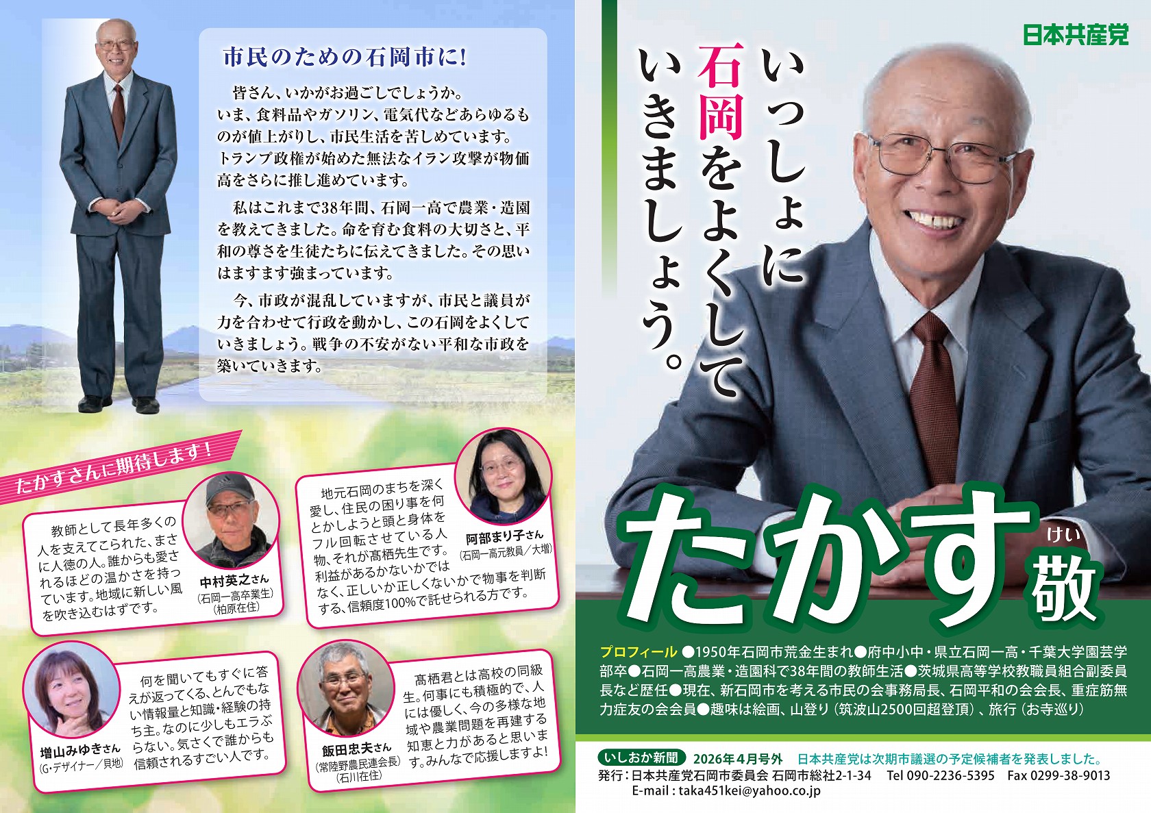 今、市政が混乱していますが、市民と議員が力を合わせて行政を動かし、この石岡をよくしていきましょう。戦争の不安がない平和な市政を築いていきます。